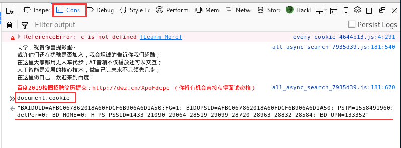 从浏览器控制台代码看:按Fn+F12打开控制台,选择控制台标签页,在标签页底端输入命令document.cookie点击回车,就会出现当前网页的cookie。