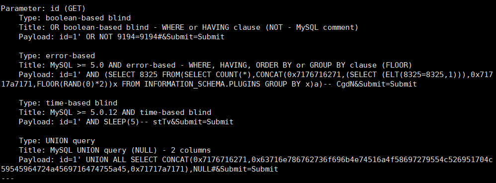 确定参数ID存在漏洞,而且可以通过基于报错的注入,联合查询注入来进行注入操作,并给出了对应的Payload语句。