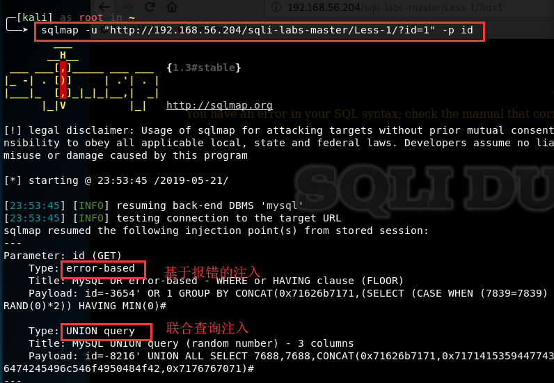 sqlmap -u "http://192.168.56.204/sqli-labs-master/Less-1/?id=1" -p id