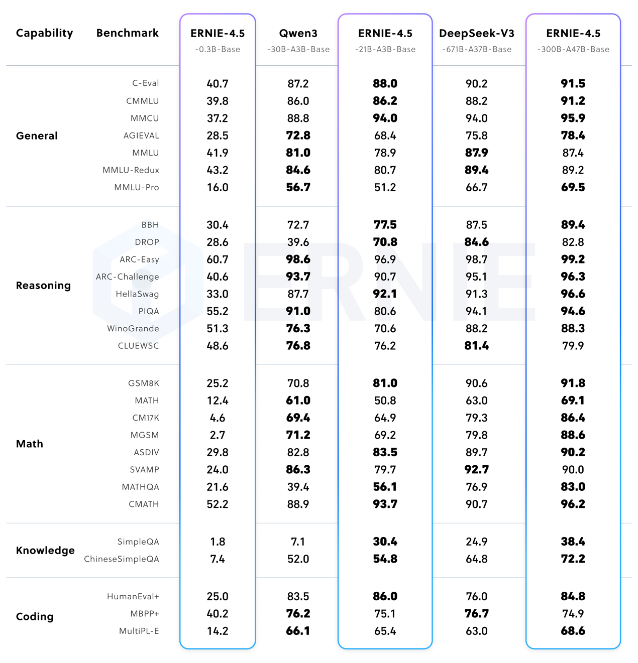 | ERNIE-4.5-300B-A47B-PT | 300B | 47B | MoE | Text | PT |