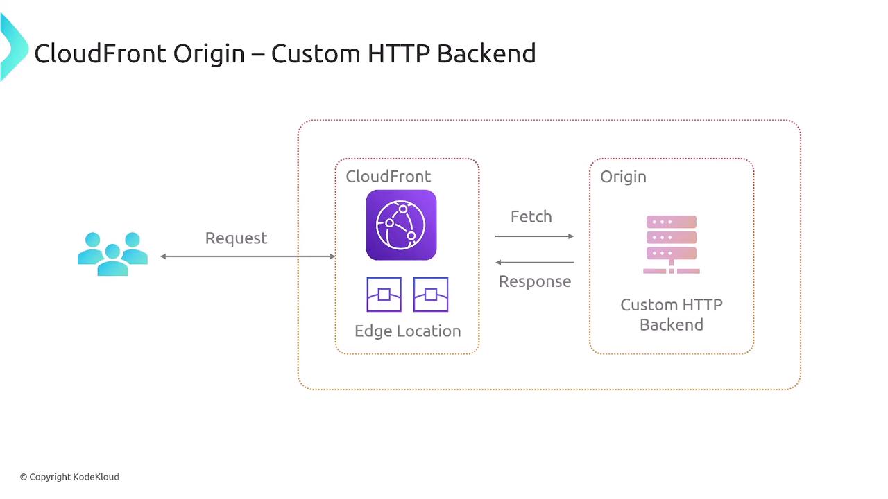 - 源站(Origin): 内容的权威来源,存储所有文件的原始版本。当边缘站点没有缓存内容时,会回源站获取最新内容。CloudFront 支持多种类型的源站,最常见的是 Amazon S3 存储桶(适用于存放静态文件)以及自定义源站(例如 EC2 实例、负载均衡器或其他 HTTP 服务器)。
