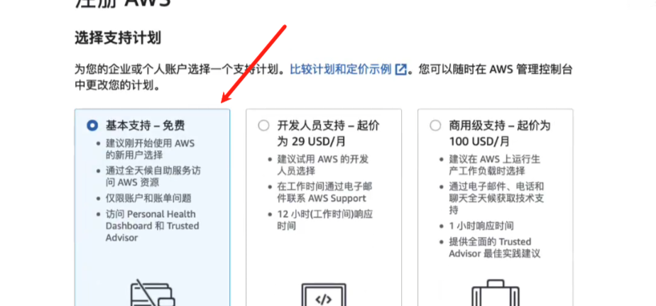 - 选择支持计划:个人用户选 “基本支持(免费)”,企业按需选择付费计划。
