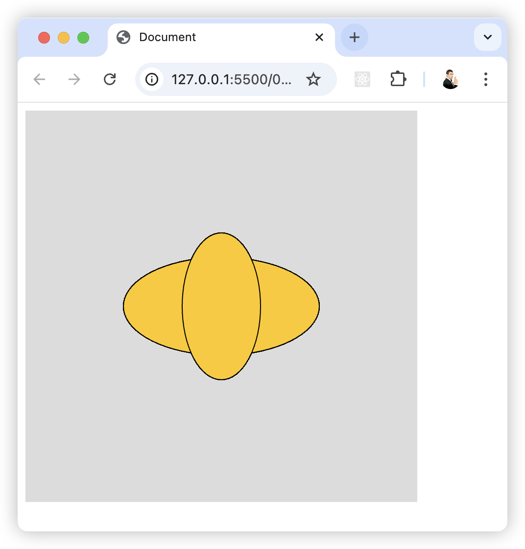 在浅灰色画布上,有一个黑色边框的横向椭圆(像压扁的圆),中间叠加了一个黄色的纵向椭圆(像拉长的圆)。