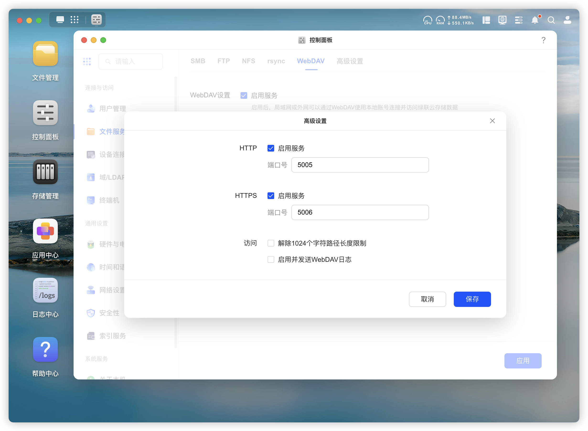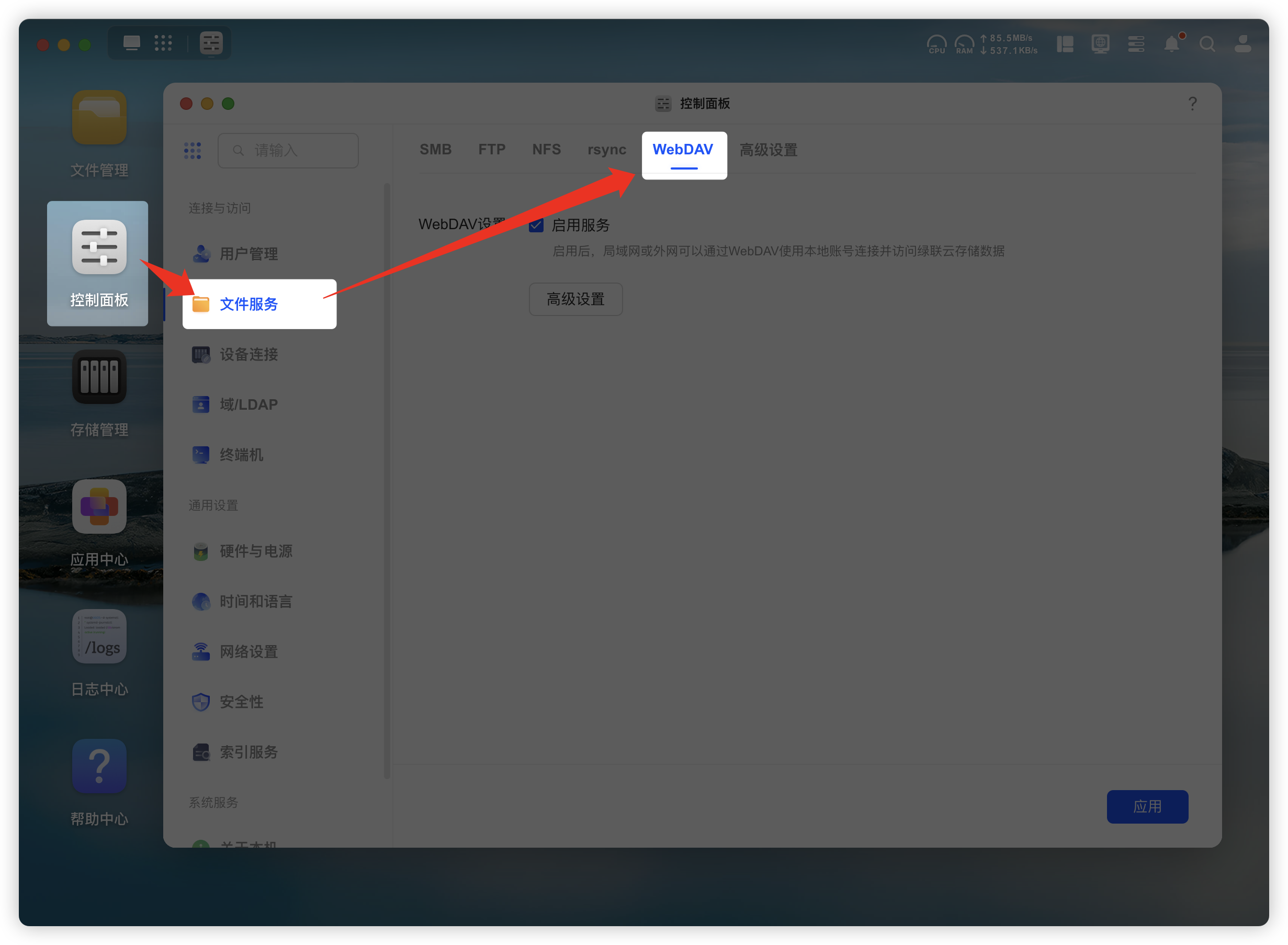 然后打开绿联的控制面板 - 文件服务 - WebDAV。