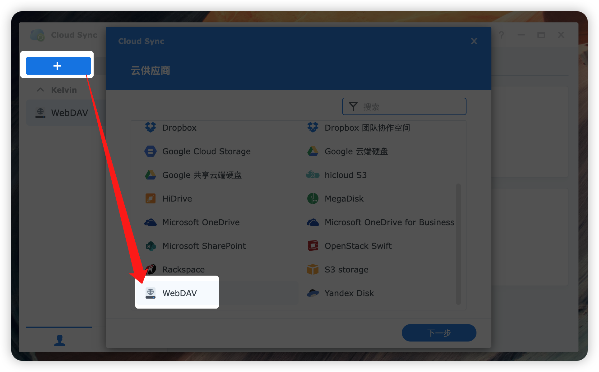装好之后打开它,点击左上角的加号,在“云供应商”列表里拉到最下面,选择“WebDAV”。