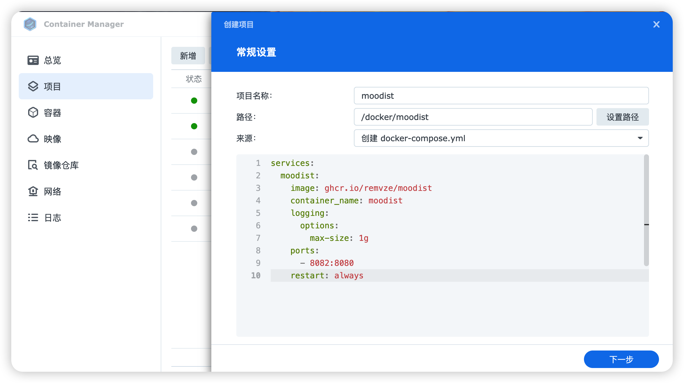 /docker/moodist文件夹。 - 来源:选择“创建 docker-compose.yml”。