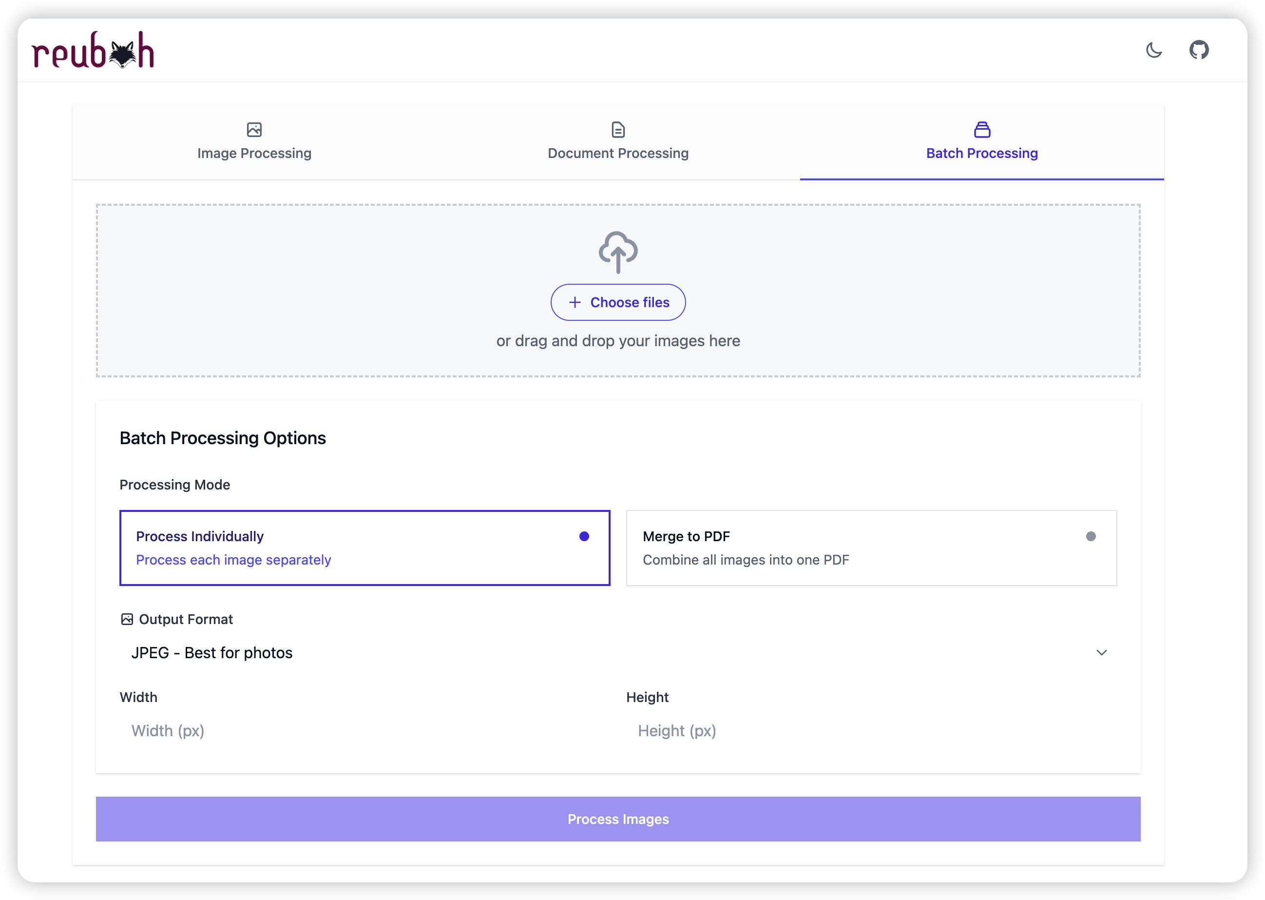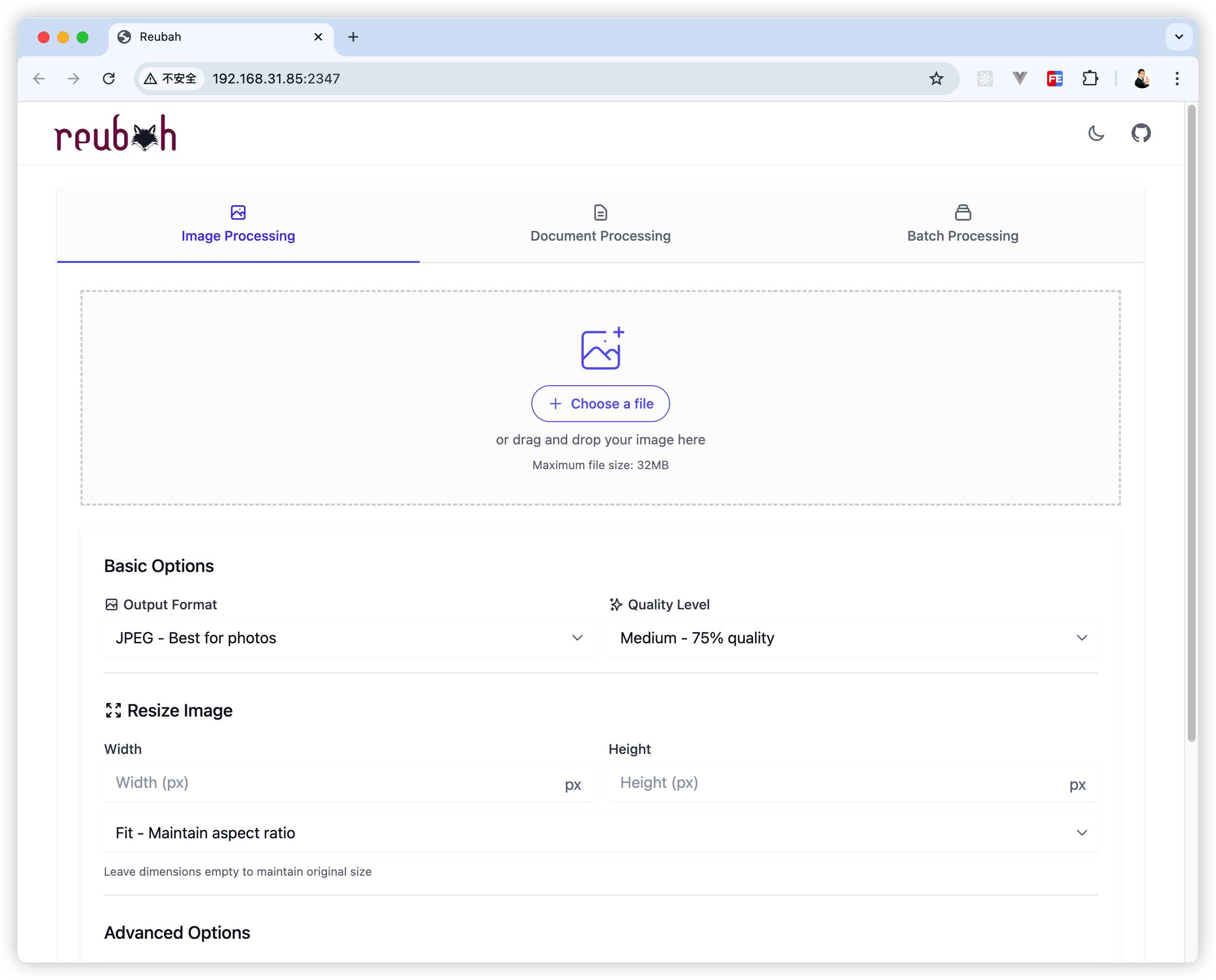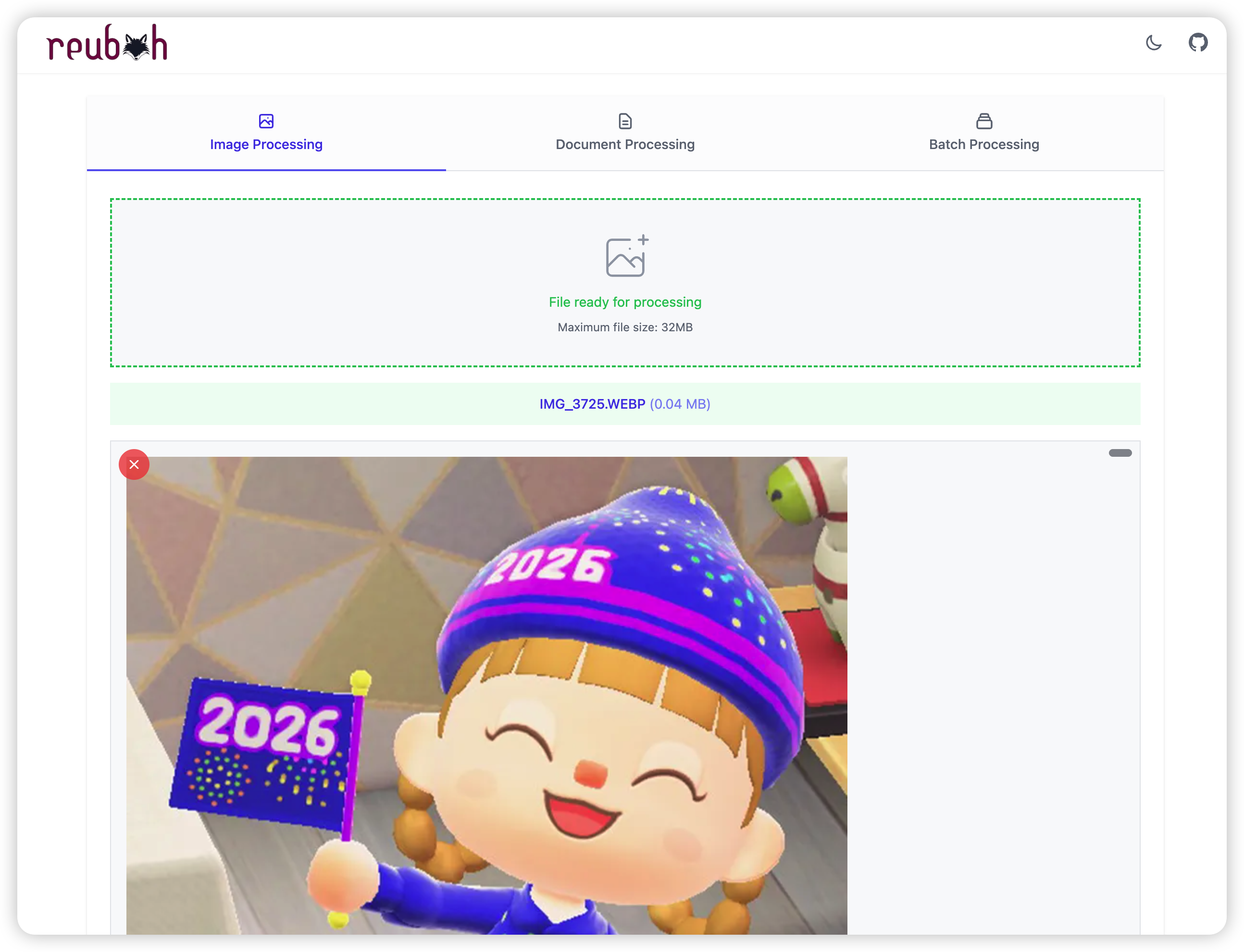 Reubah 是一款基于网页的工具,具备图片格式转换、优化、批量处理(背景移除即将推出)和多种文档格式转换功能,支持暗黑模式与 API,无文件存储且自动清理,可通过 Docker 或本地部署,界面简洁易用。
