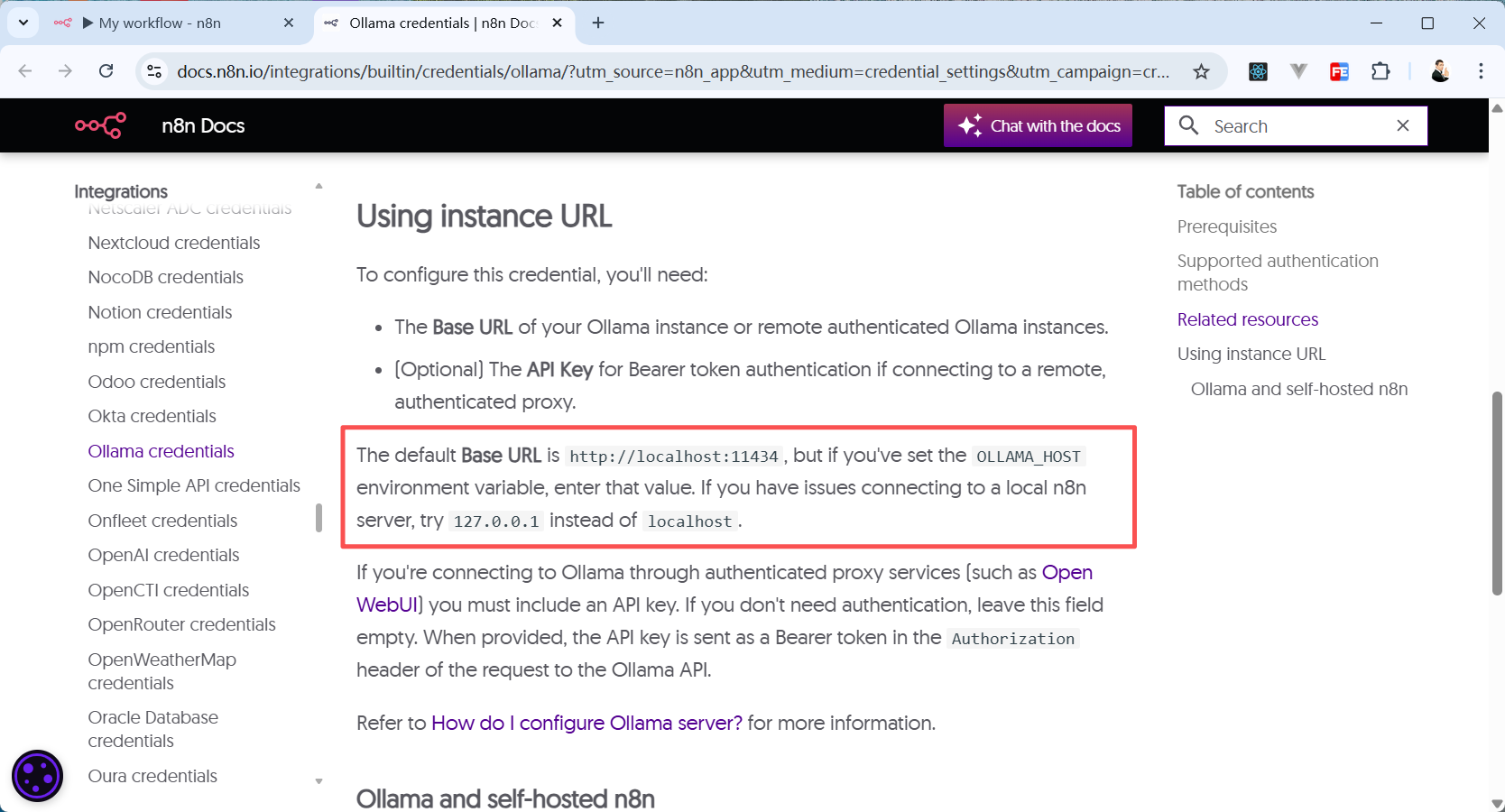 打开红框报错信息下方橙色方块里的文档(Open docs)可以看到,n8n 官方文档叫我们试试使用 127.0.0.1 代替原来的 localhost。