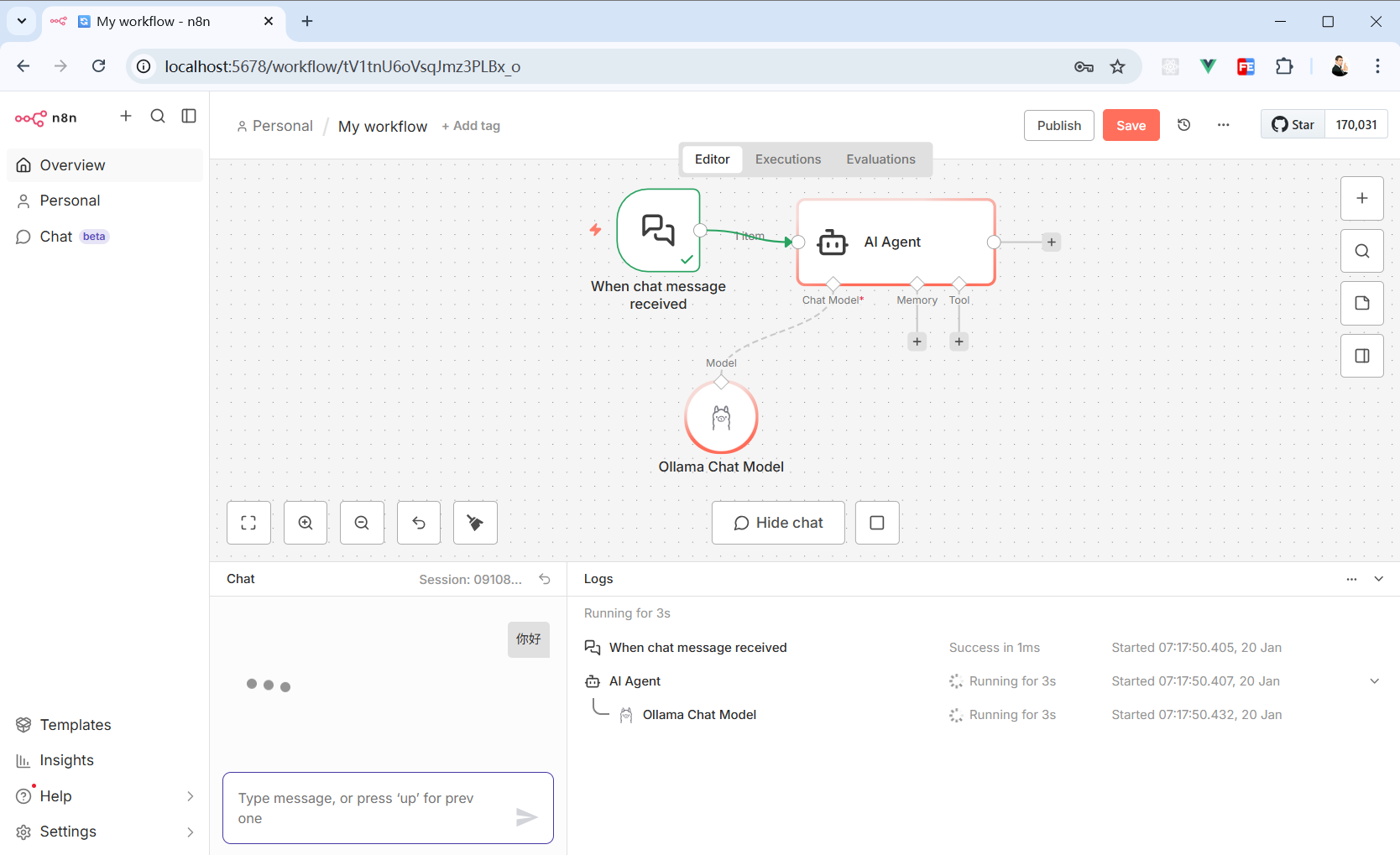 点击这个工作流的第一个节点“Chat Trigger”就会在页面底部弹出一个聊天窗。