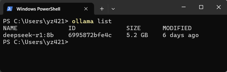 模型下载成功后,可以使用 ollama list 查看当前电脑下载过的所有模型。
