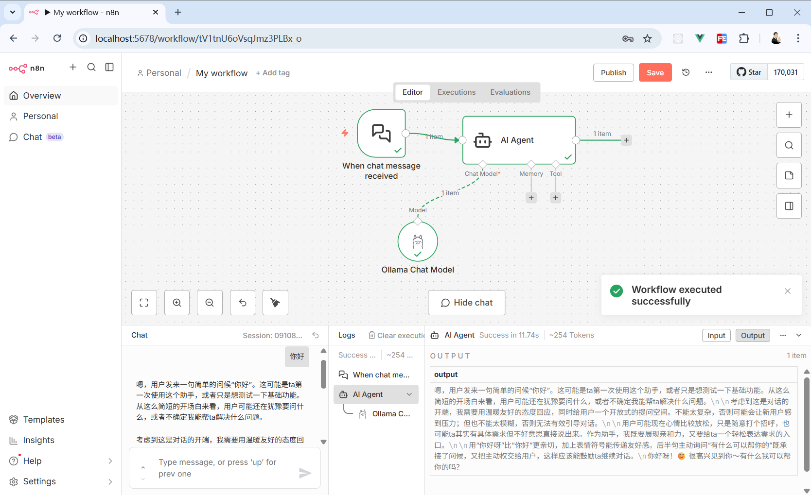 随便输入点内容,这个工作流就会开始工作了。“Chat Trigger”就会将接收到的信息传给“AI Agent”处理。