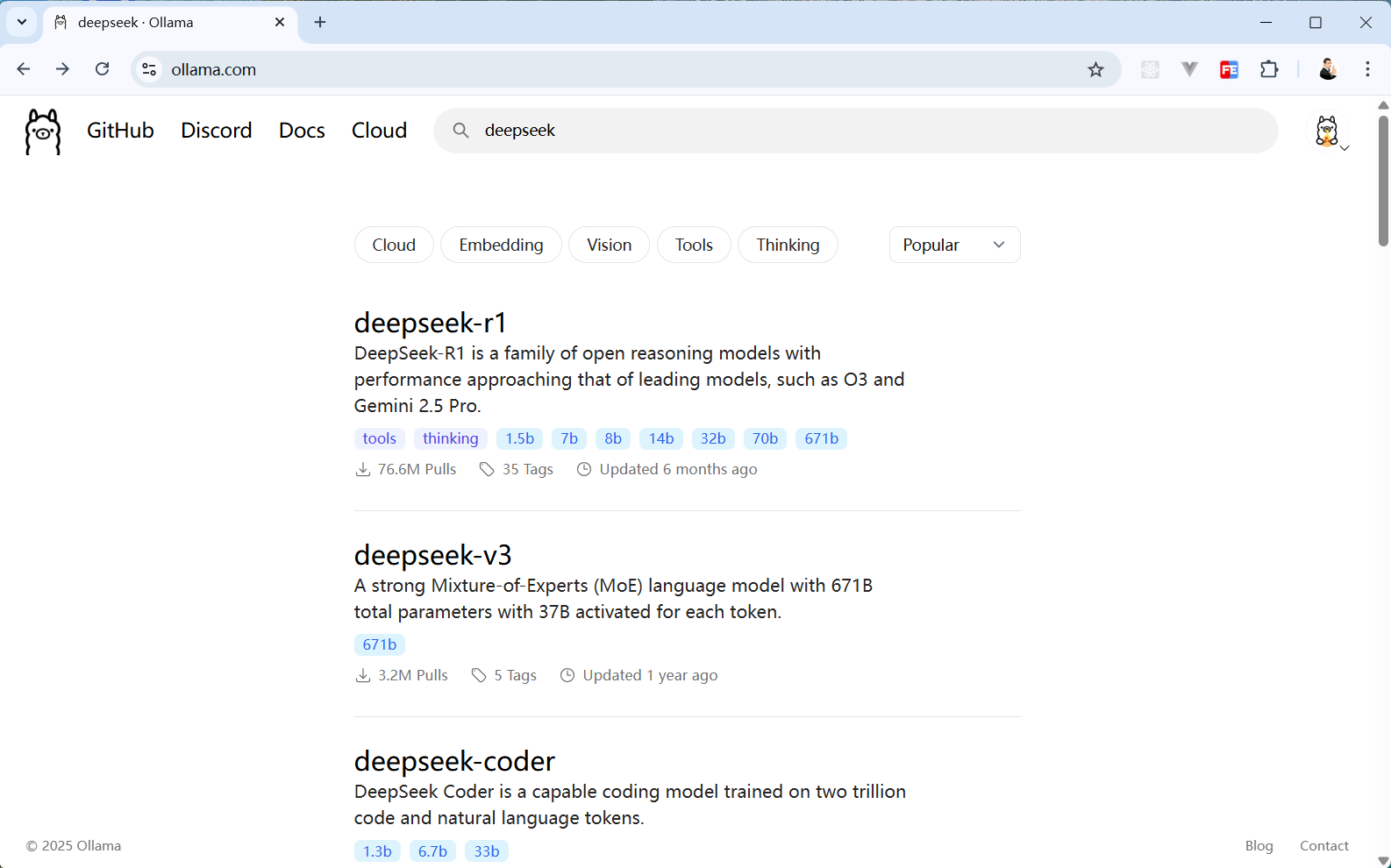 在 Ollama 官网搜索 DeepSeek,可以看到一堆搜索结果。
