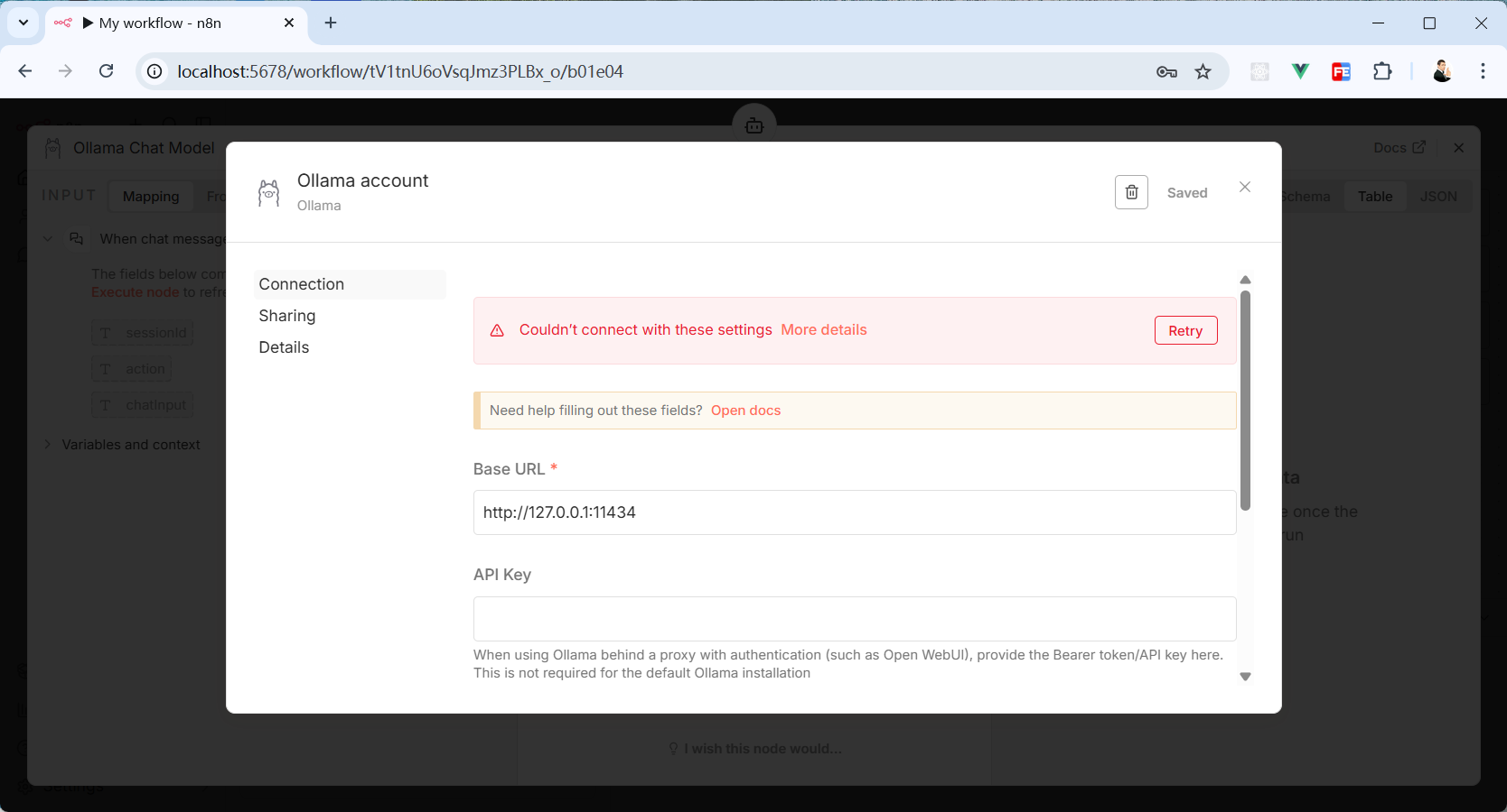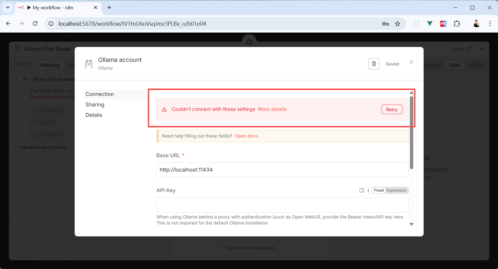 点击弹窗右上角的“Save”按钮会发现报错了。意思是连不上 Ollama。