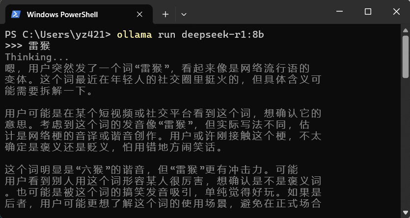 打开终端输入下面这条命令就开始下载并自动运行 deepseek-r1:8b 这个模型。