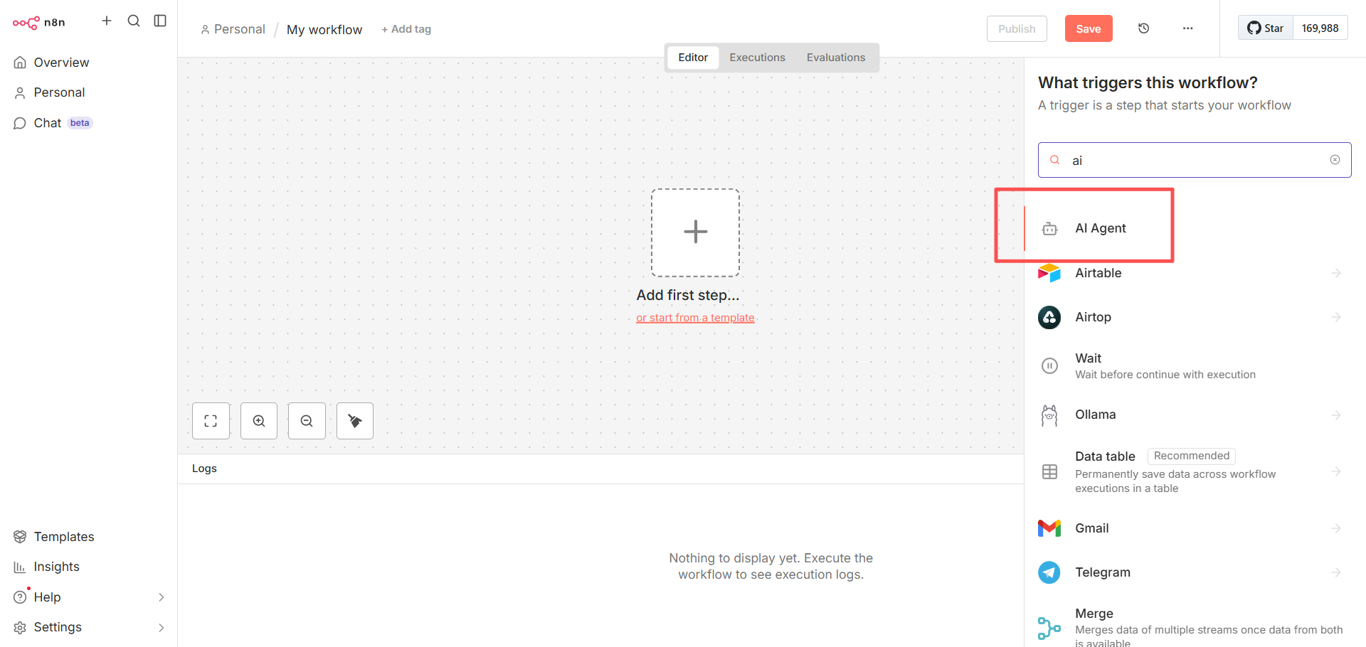 点击画布中间的加号,在节点面板搜索 ai ,创建一个 AI Agent 节点。