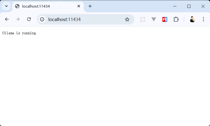 模型运行成功后,我们在浏览器打开 localhost:11434 ,如果看到浏览器页面出现 Ollama is running 证明运行成功。