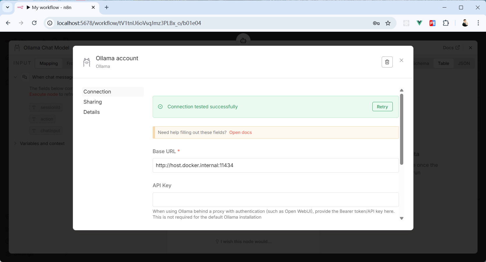 替换成 host.docker.internal 再次点击保存,就可以看到“Connection tested successfully”的提示,证明 n8n 与 Ollama 连接成功了。