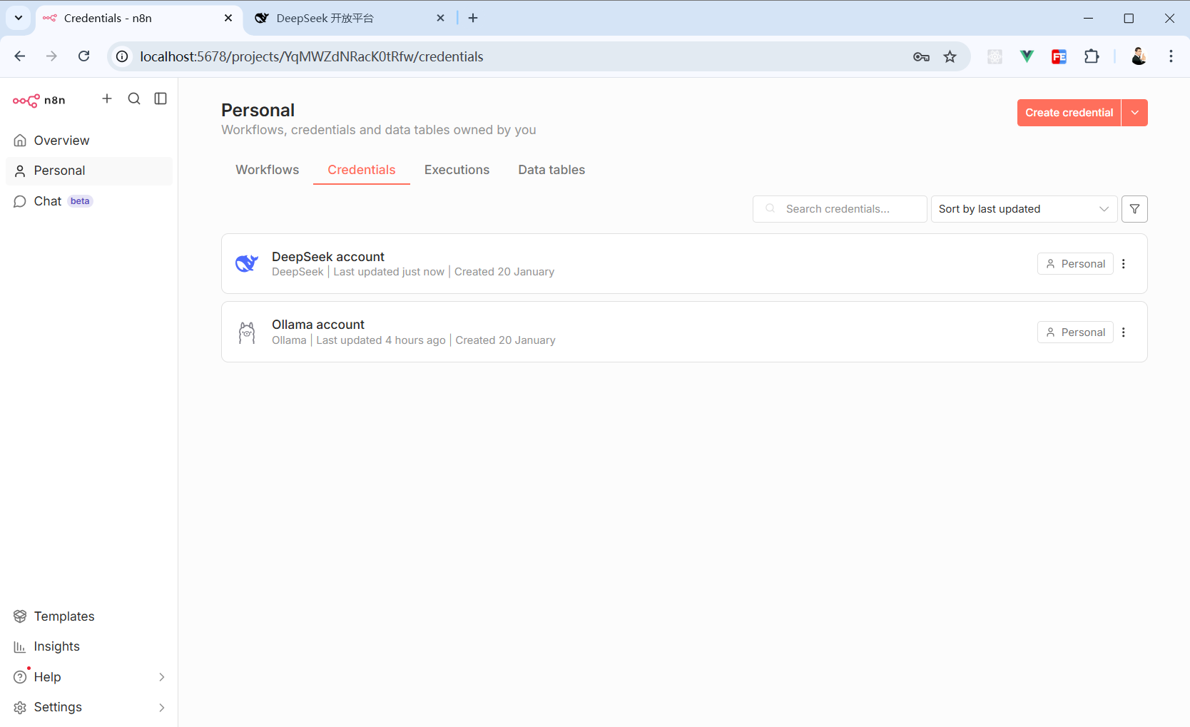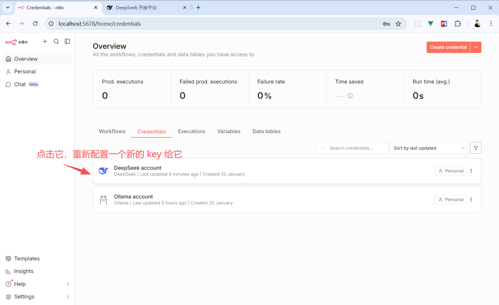 回到”Credentials“面板就能看到我们刚刚创建的 DeepSeek 凭证。