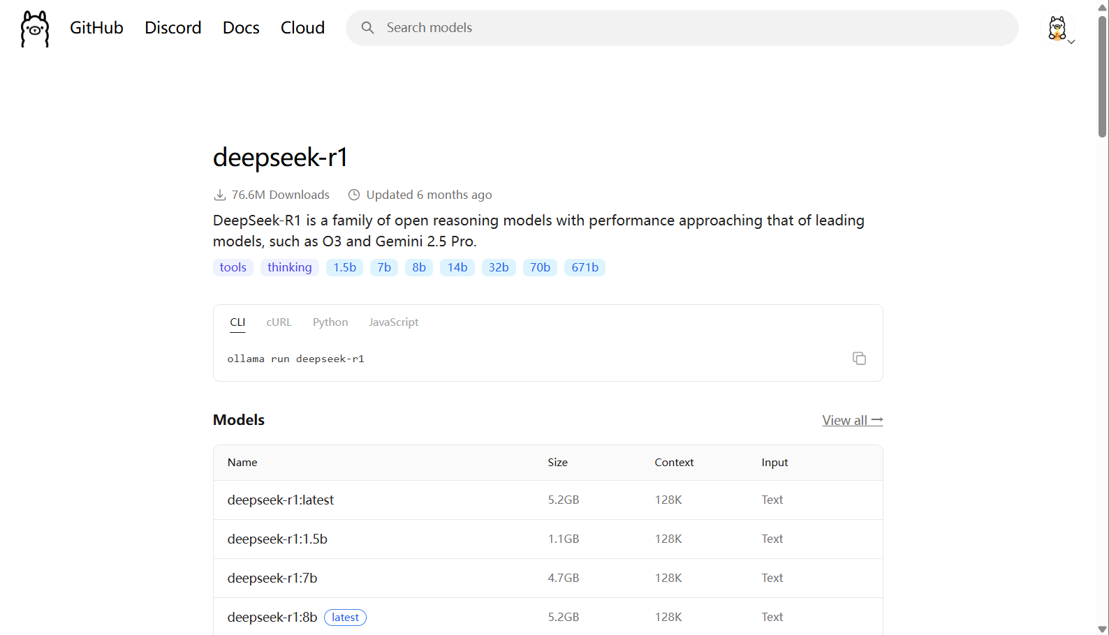 点击 deepseek-r1 可以看到这个模型又有几个不同参数规模的版本。我这次使用的是 8b 这个规模的模型。