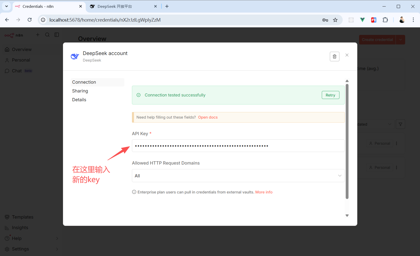 一旦发现 key 泄露了,立刻去官网删掉这个 key,再重新创建一个 key 回到 n8n 的”Credentials“面板调整。