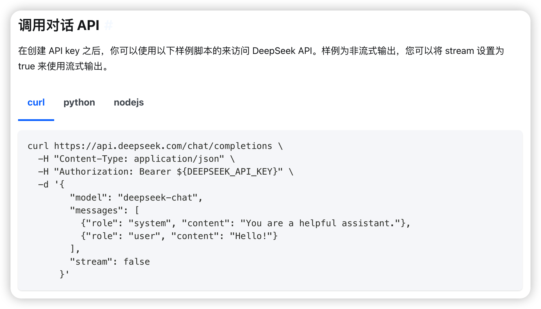 打开 DeepSeek 接口文档👉 https://api-docs.deepseek.com/zh-cn/