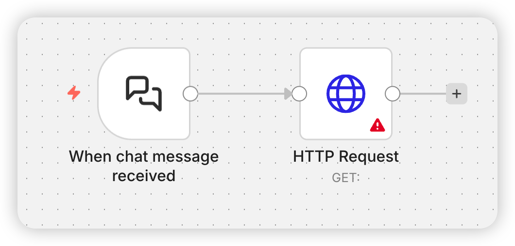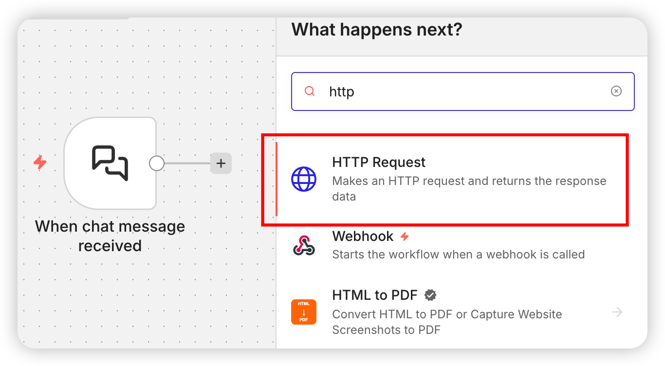 接着点击 Chat Trigger 节点 右侧的加号,在节点面板里搜索 http,将 HTTP Request 节点 添加到画布里。