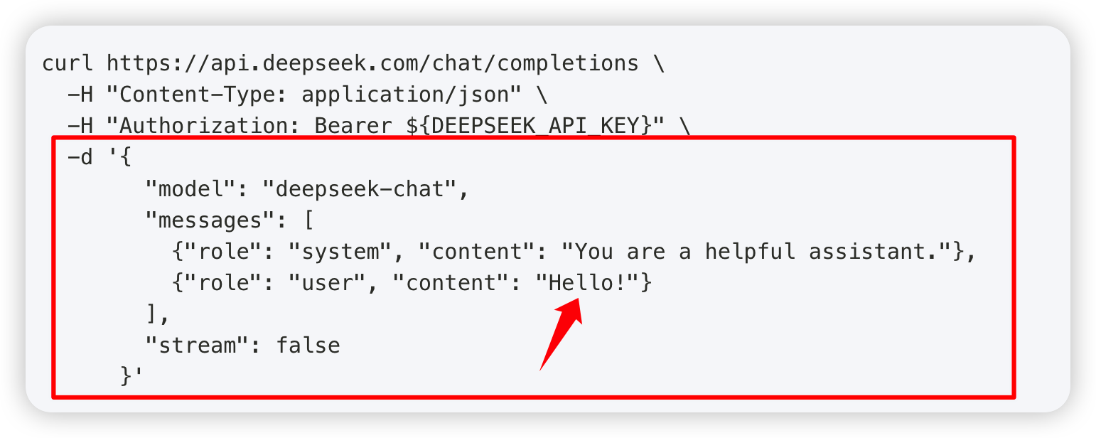 再回到 DeepSeek 官方文档提供的代码,看到有两项是 -H 开头的。这两项是“请求头”。