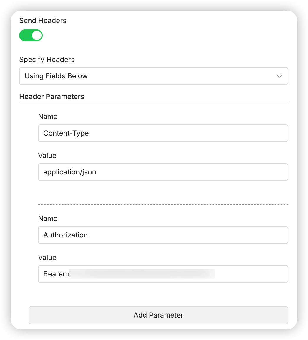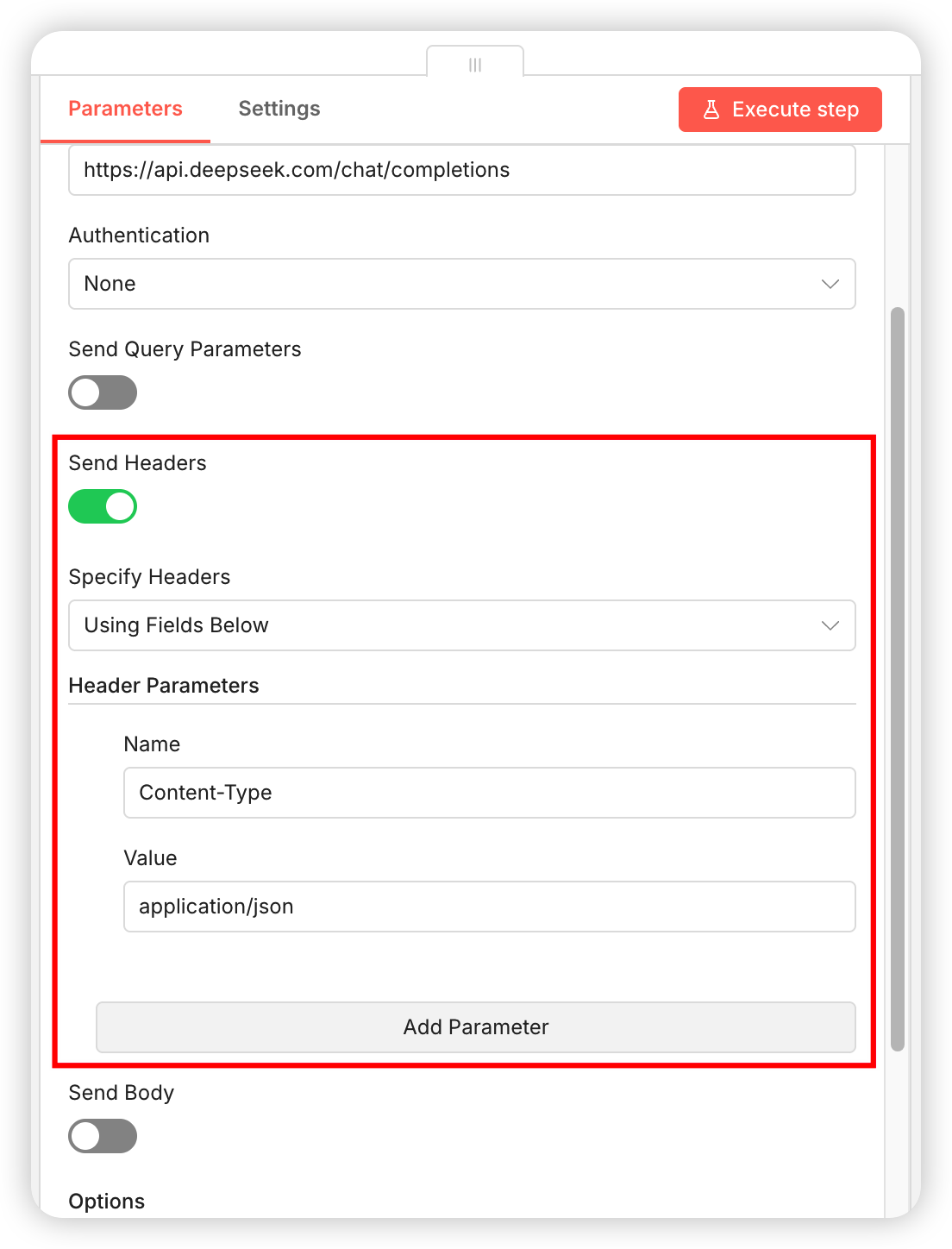 如果你没按照《『n8n』接入本地部署的 DeepSeek》里创建 DeepSeek 凭证,就需要点击 Send Headers 里的 Add Parameter 按钮创建多一项,手动填入 Authentication 和对应的 key。