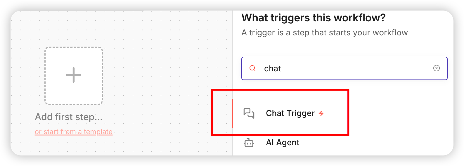 点击工作流的“加号按钮”,在节点面板里搜索 chat,将 Chat Trigger 节点 添加到画布里。