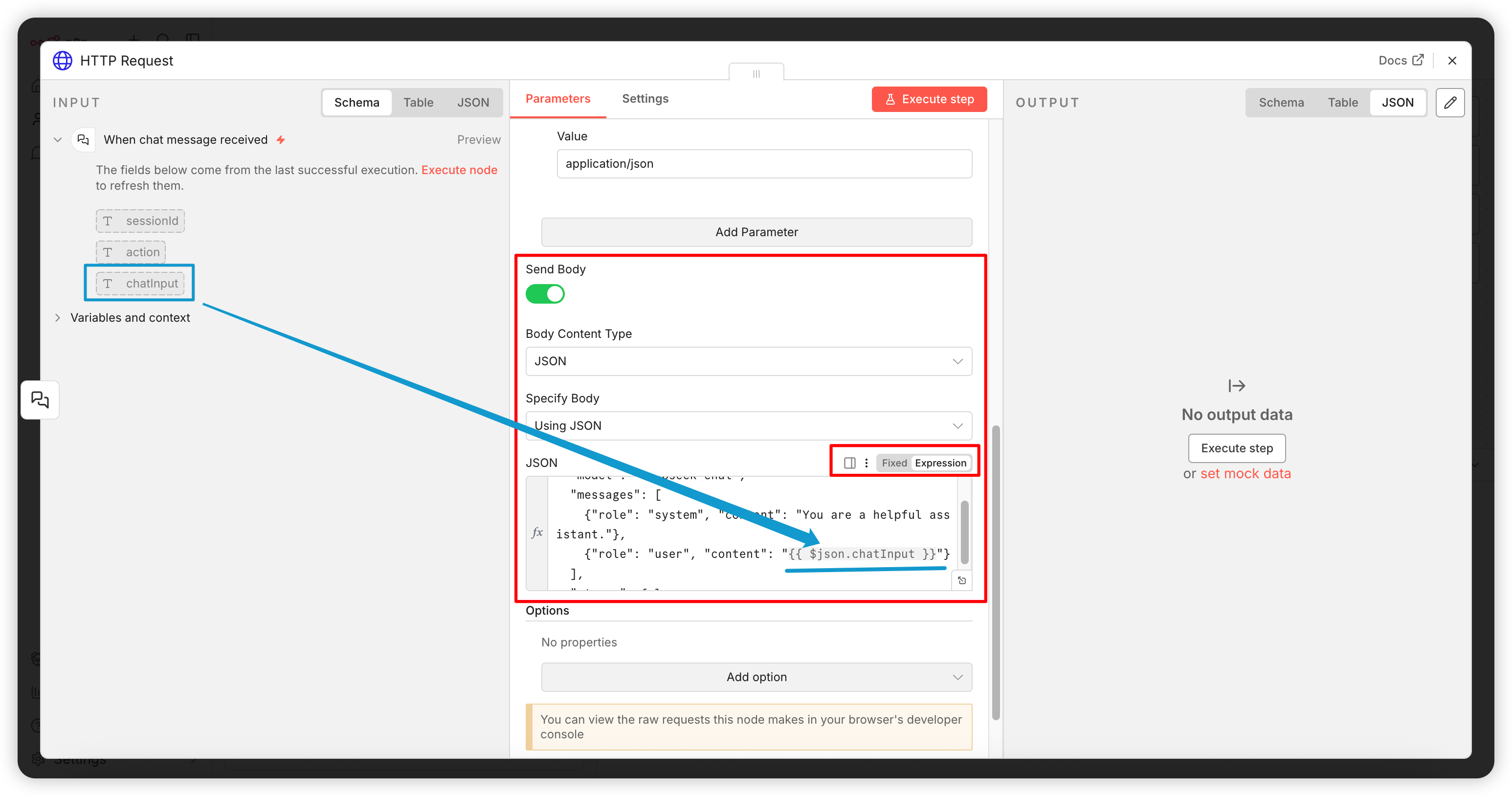 {"role": "user", "content": "{{ $json.chatInput }}"}