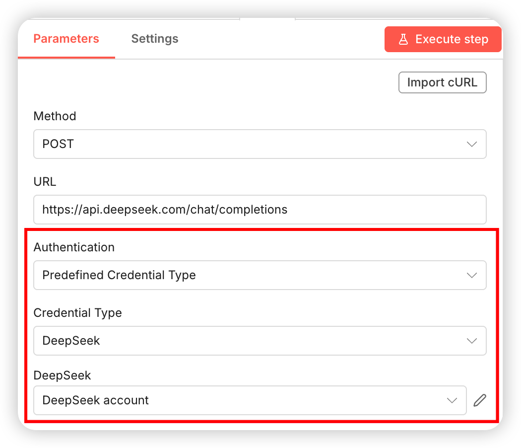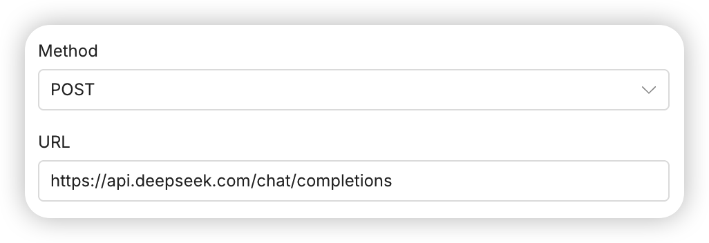 我们看 curl 这边就行,可以看到代码里 curl 后面跟着一个网址(https://api.deepseek.com/chat/completions),把这个网址填入 n8n 的 HTTP Request 节点的 URL 里。