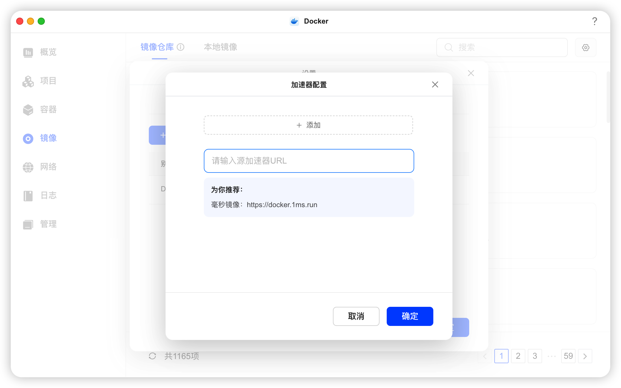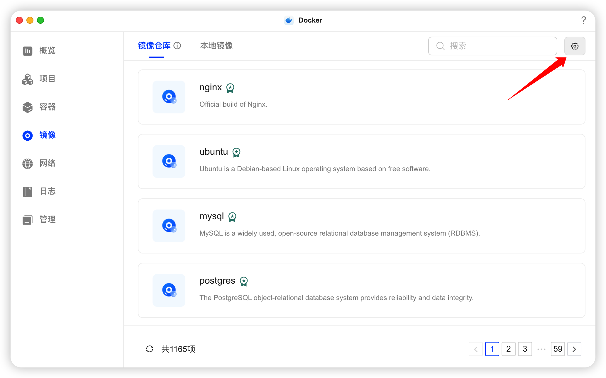 打开 Docker,切换到「镜像」页面,点击右上角的“齿轮”按钮。