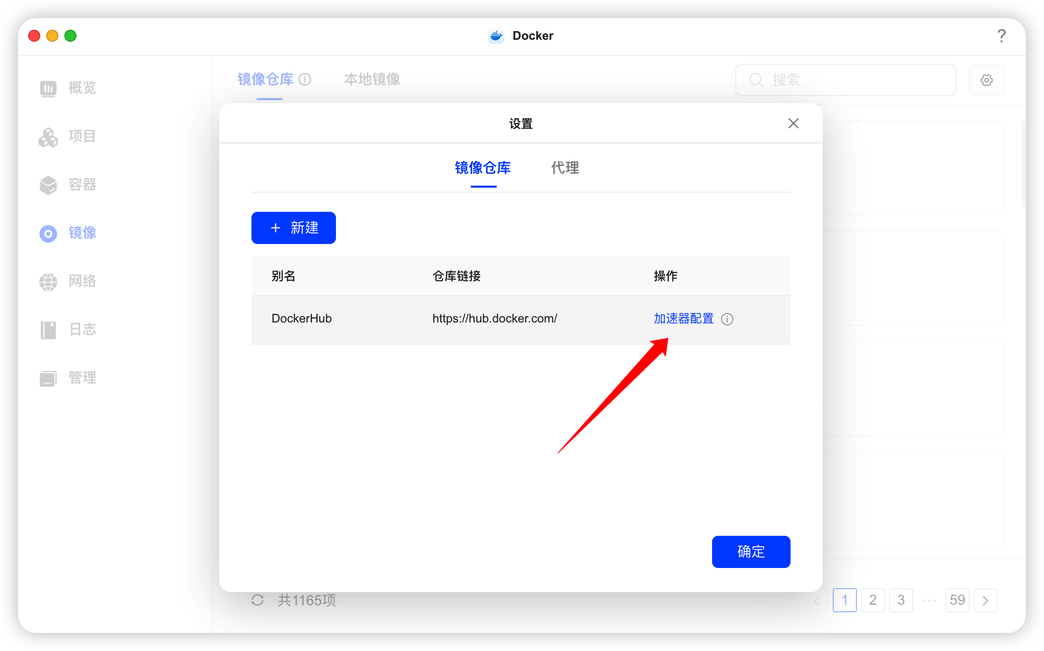 在「镜像仓库」这里,点击下图箭头所指的「加速器配置」按钮。