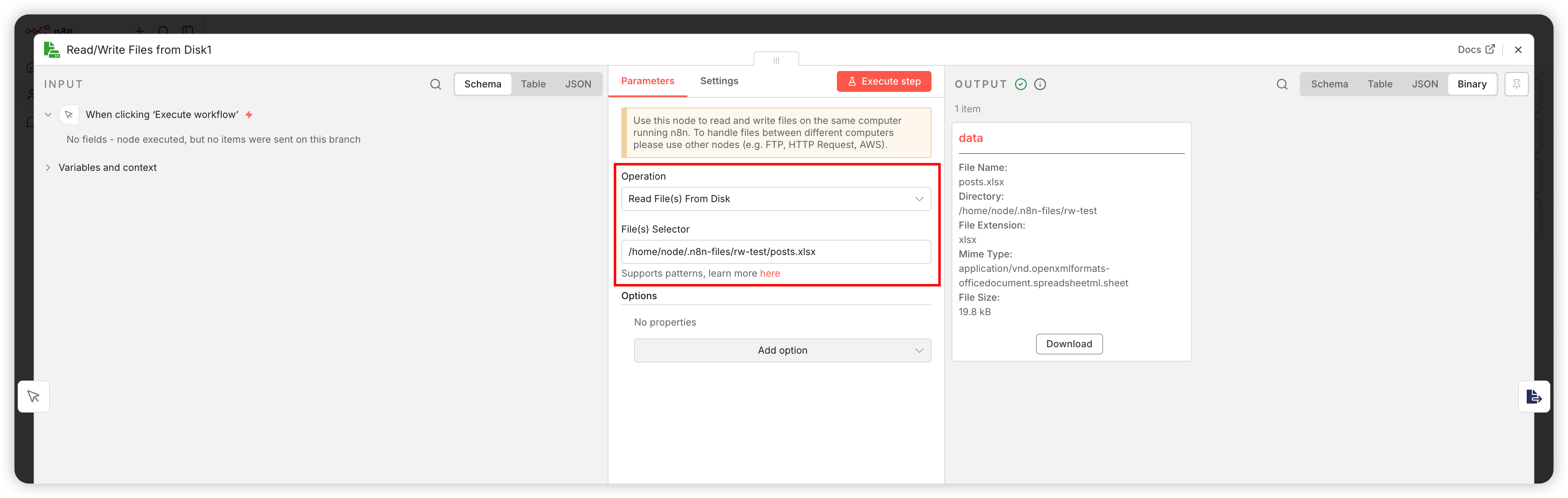 在这个工作流中,「Read Files from Disk」的 Operation 选择 Read File(s) From Disk,再指定一个文件路径就行了。