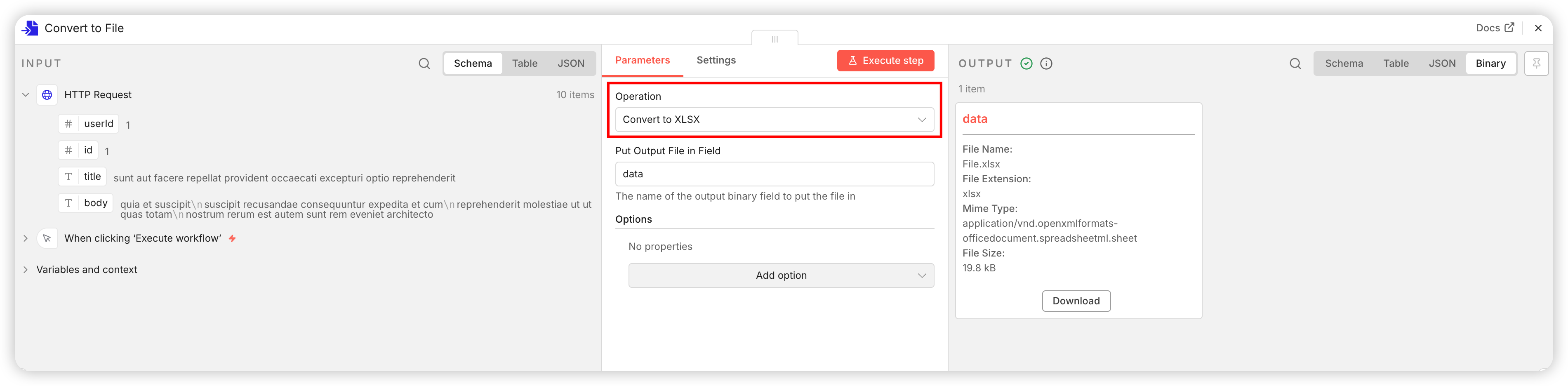 我将「HTTP 节点」请求回来的数据转成 Excel 文件,并将输出的对象放到一个 data 字段里。