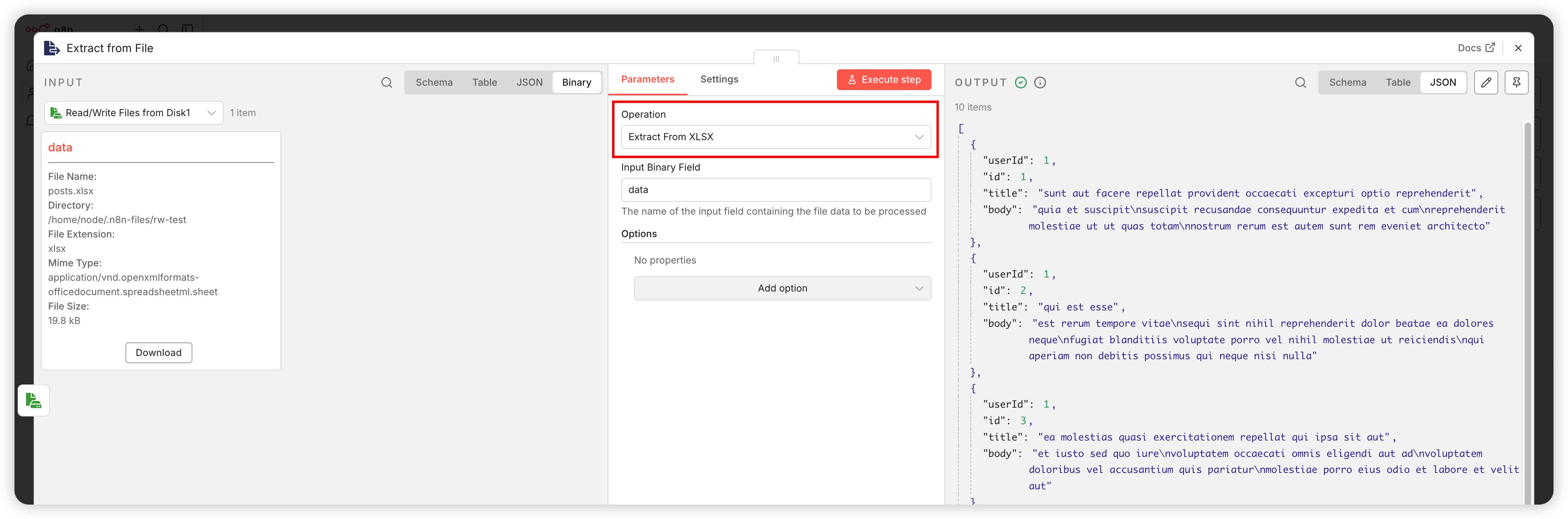 在「Extract from File 节点」里,我们要正确设置 Operation 的值,这个参数指的是现在读取到的文件对象它原本是什么格式(比如我这个是 Excel 文件,就用 Extract From XLSX,其他格式就用其他类型)。