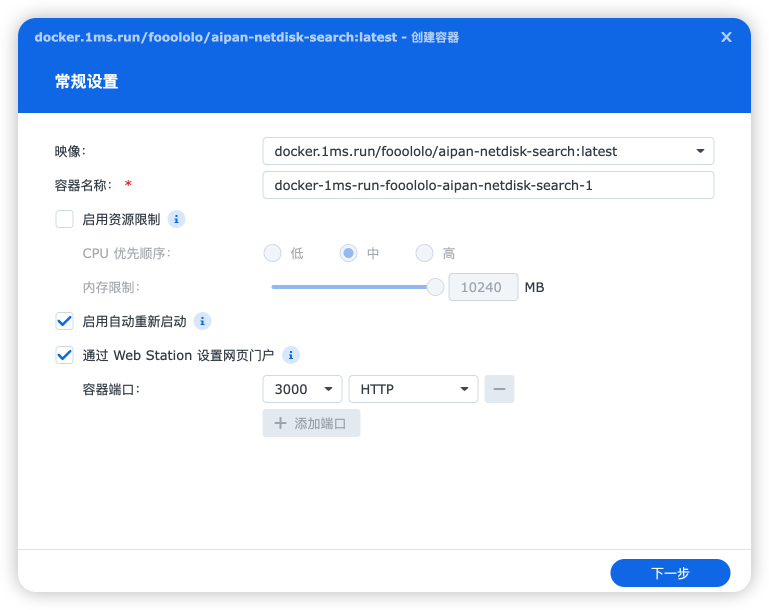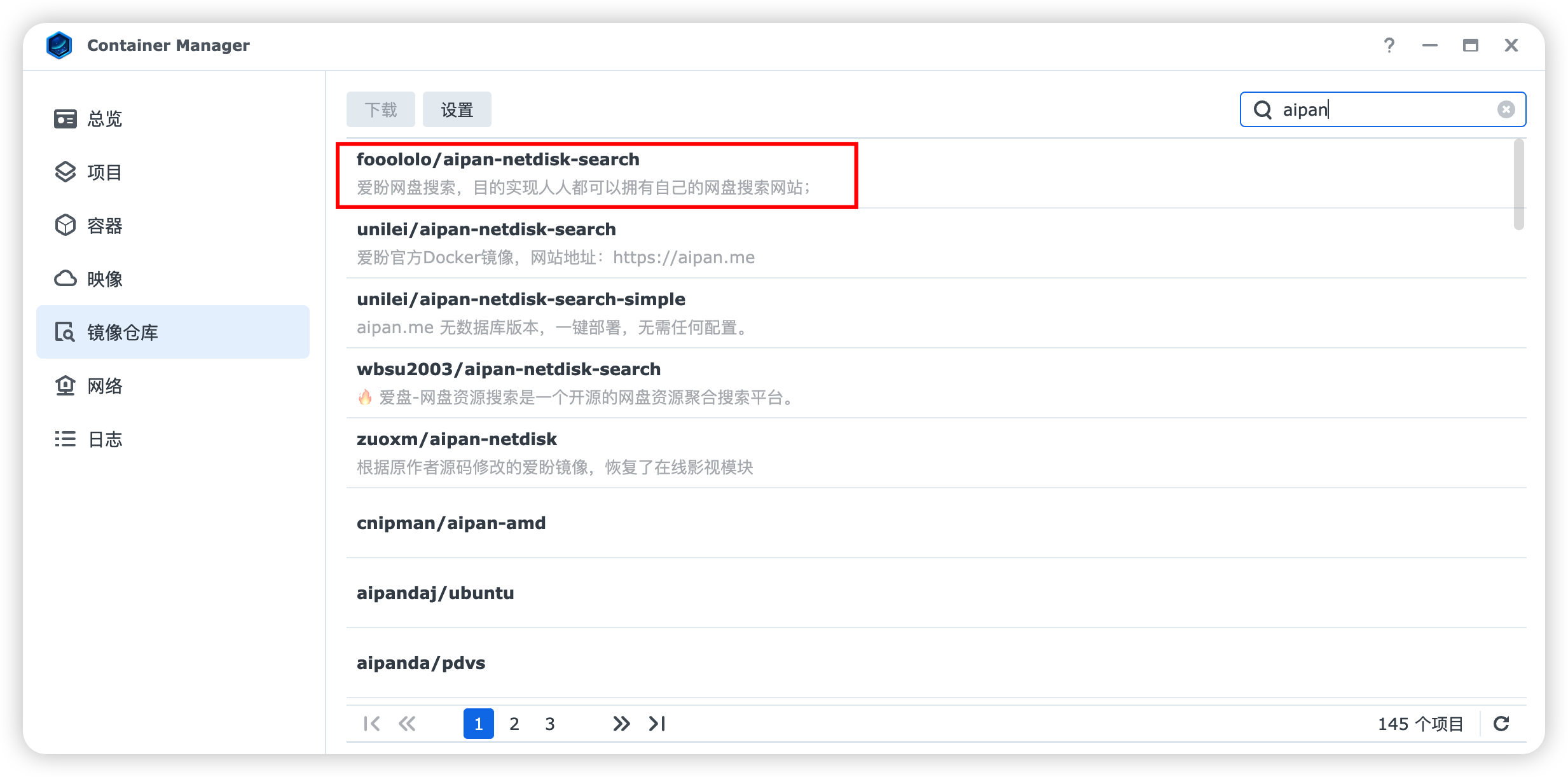 在“Container Manager”的「镜像仓库」里搜索“aipan”,下载“fooololo/aipan-netdisk-search”这个。