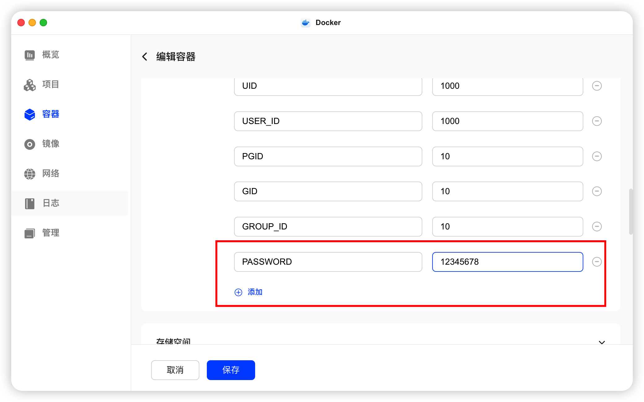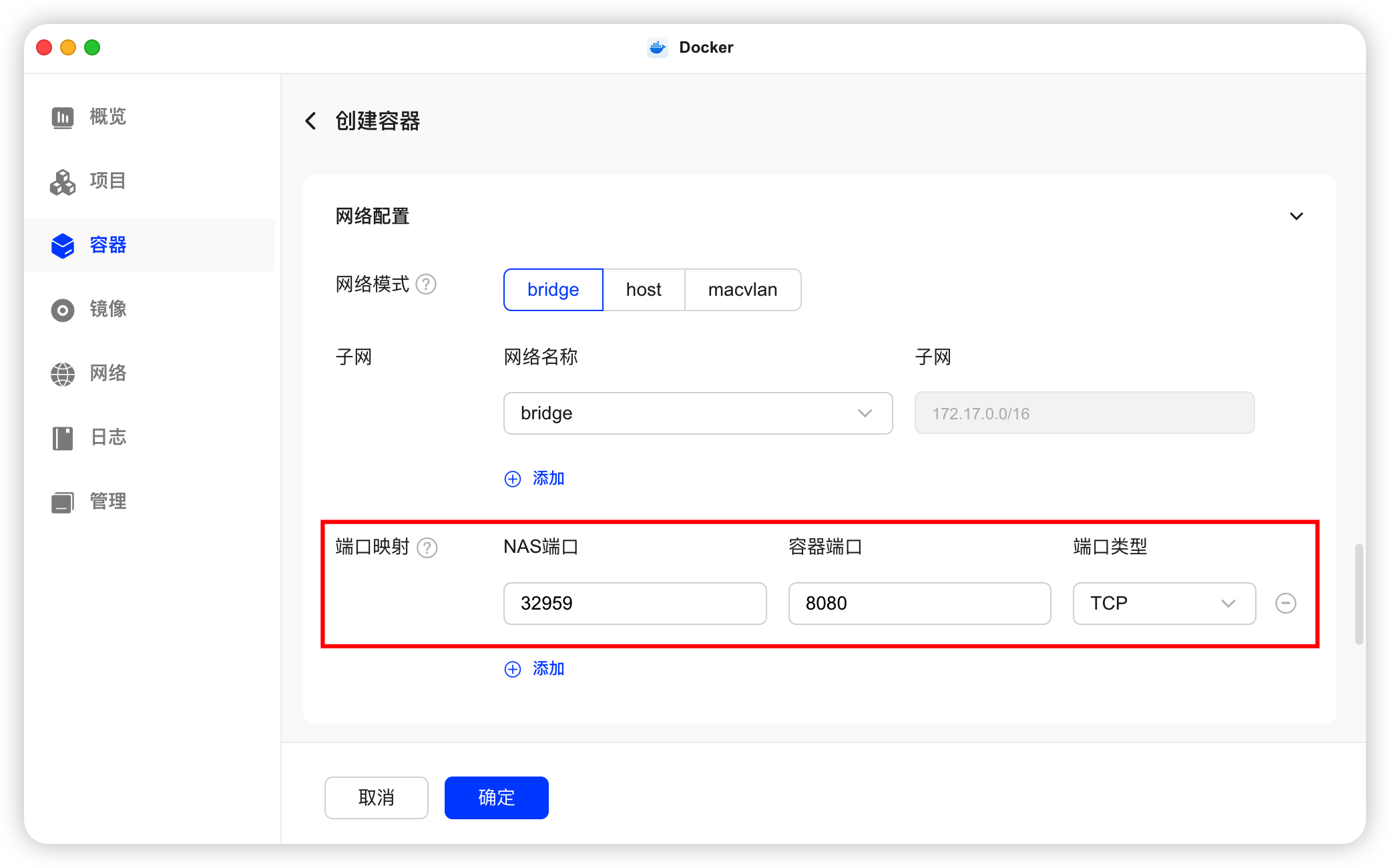 在容器配置页,设置一个「NAS端口」,比如我这里设置登录 32959。