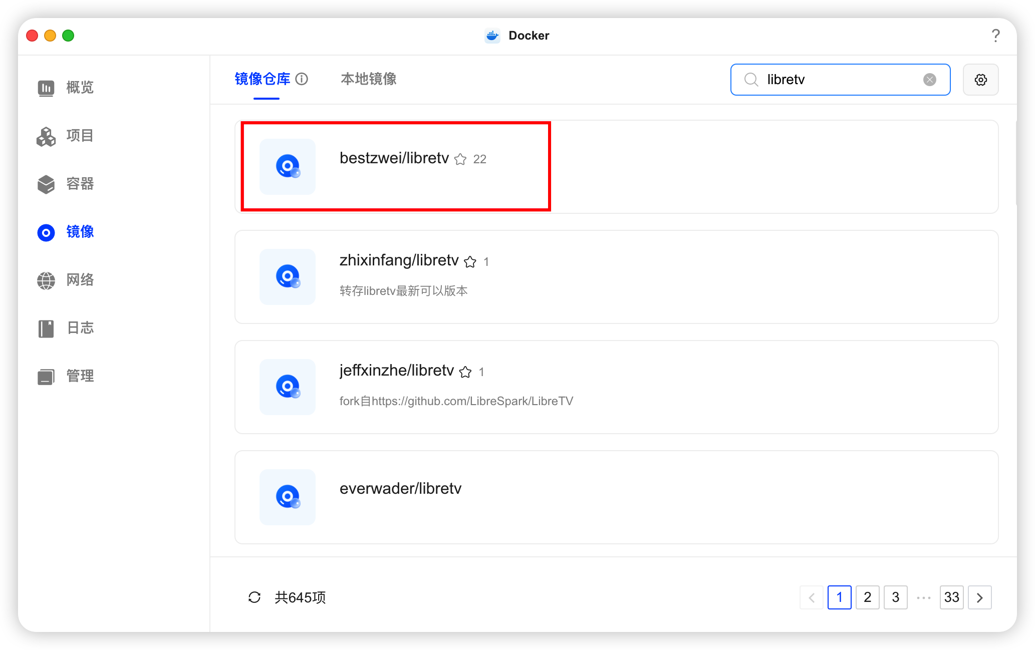 打开 Docker,在「镜像」里搜索“libretv”,找到红框的这个下载它。