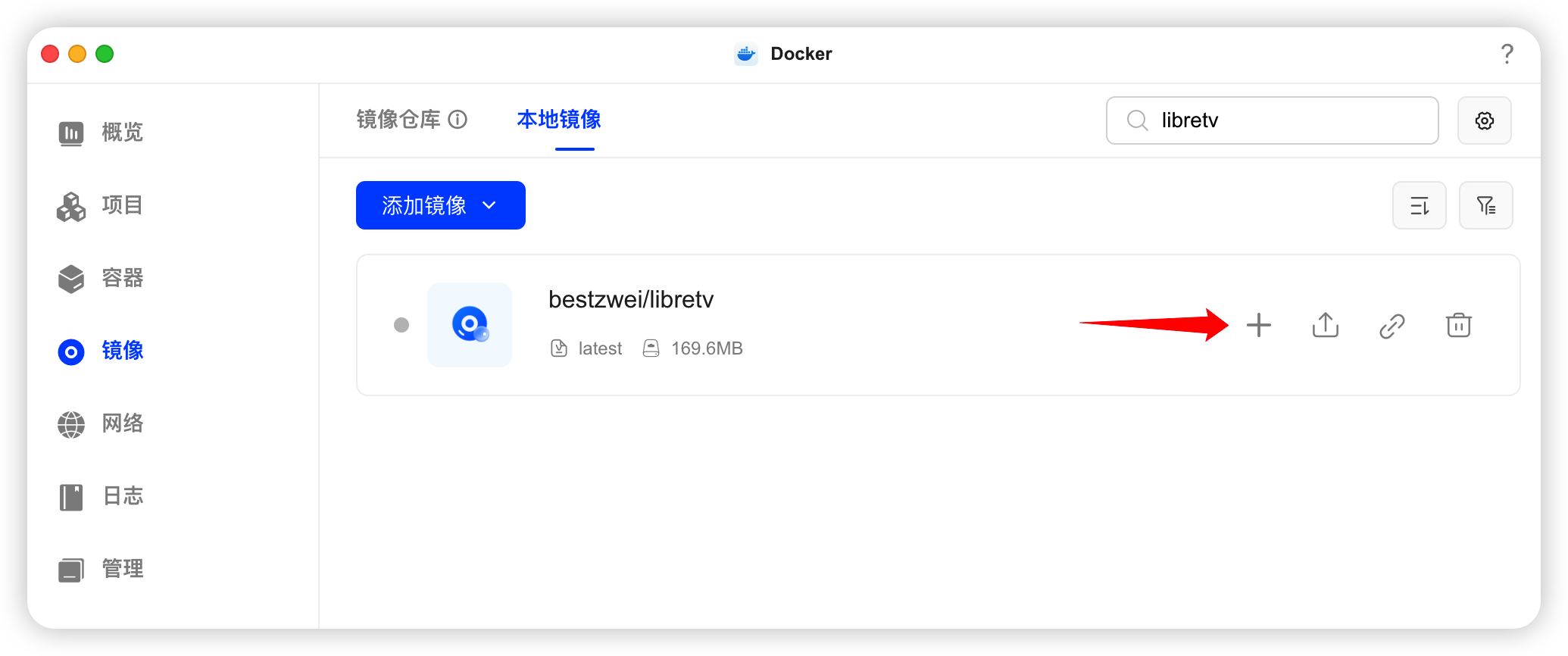 下载成功后,切换到「本地镜像」,点击 libretv 旁边的加号开始创建容器。