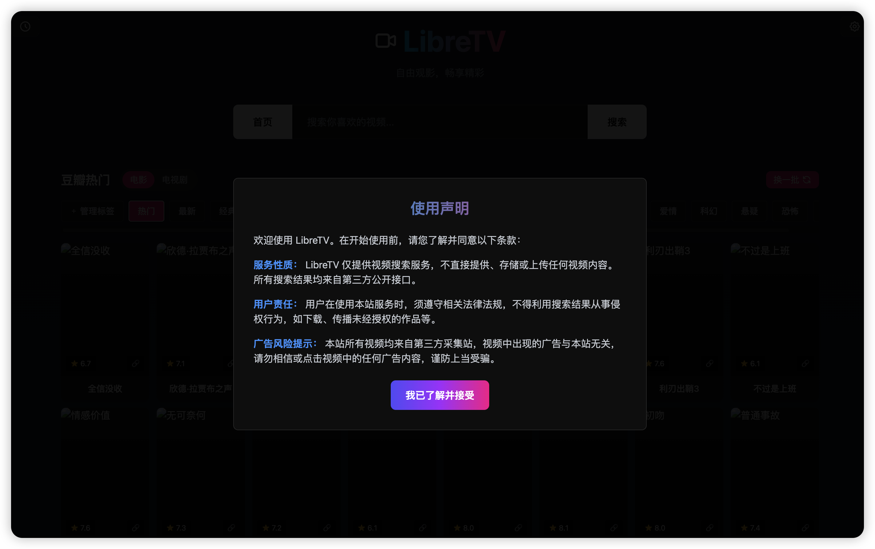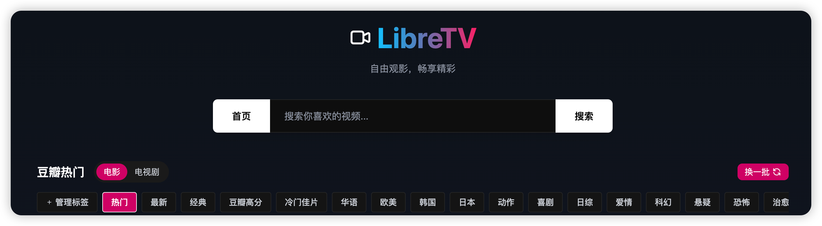 LibreTV 是一款开源免费的流媒体资源聚合与播放工具,支持整合各类视频资源、适配多种流媒体协议,具备简洁直观的操作界面,可通过自托管(适配 NAS 等设备)或直接使用,能满足用户在线观影、资源分类浏览的需求。