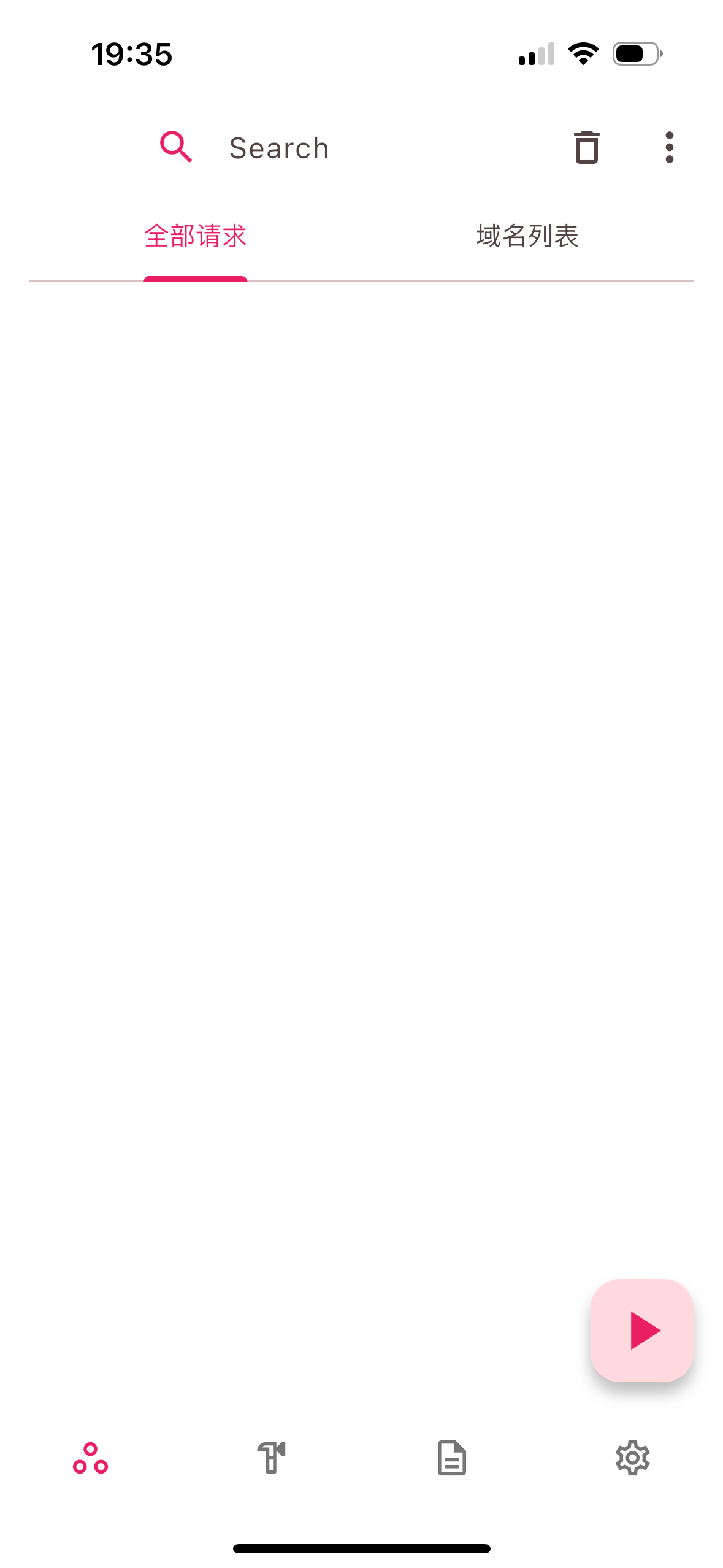 打开「ProxyPin」,完成初始化配置后(跟着软体指示点点点就行),点击右下角的“开始”按钮(那个粉红色三角形按钮)。