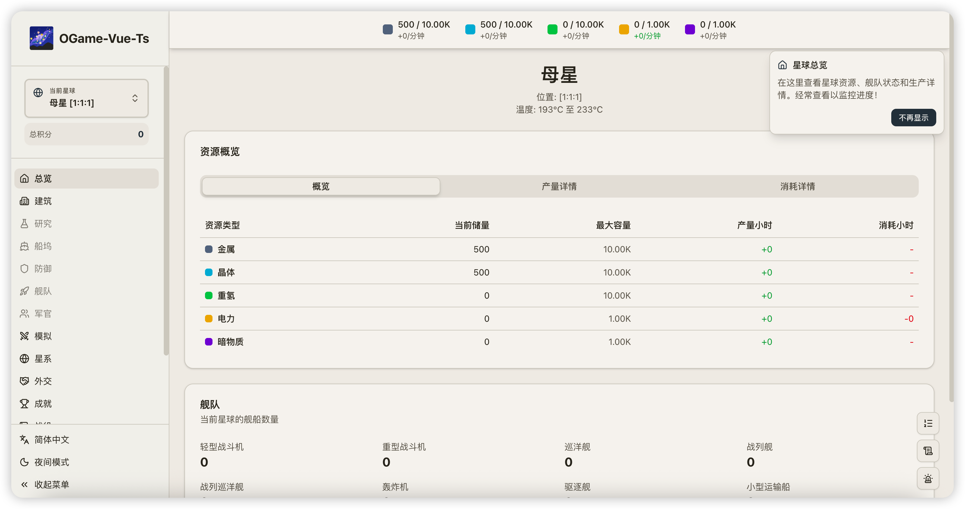 ogame-vue-ts 是一款基于 Vue 3 和 TypeScript 构建的单机版浏览器太空策略游戏,受经典 OGame 启发,支持在浏览器中建立太空帝国、研究科技、建造舰船与防御设施、参与太空战斗。