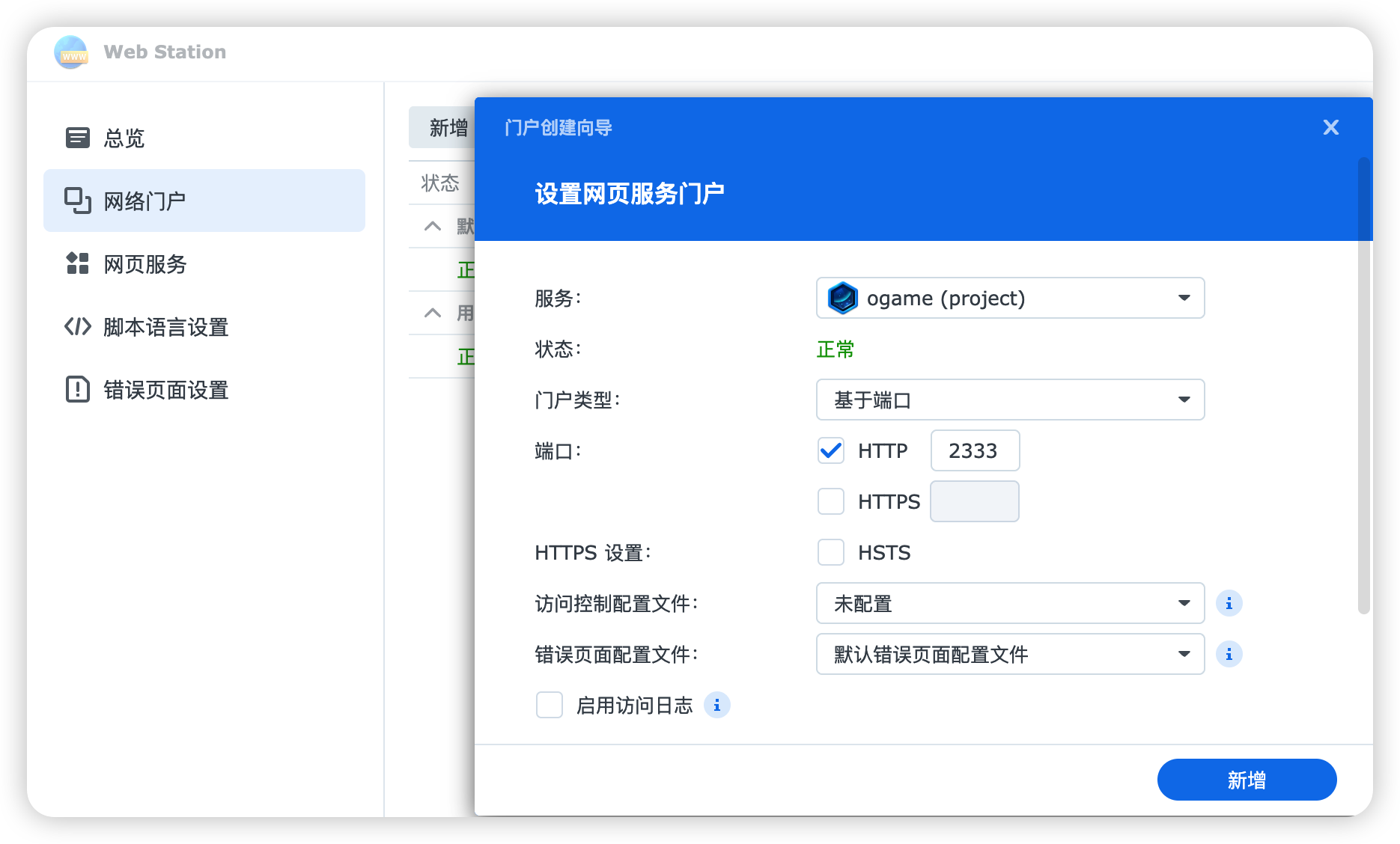 在“Web Station”新增一个“网络门户”,配置如下。